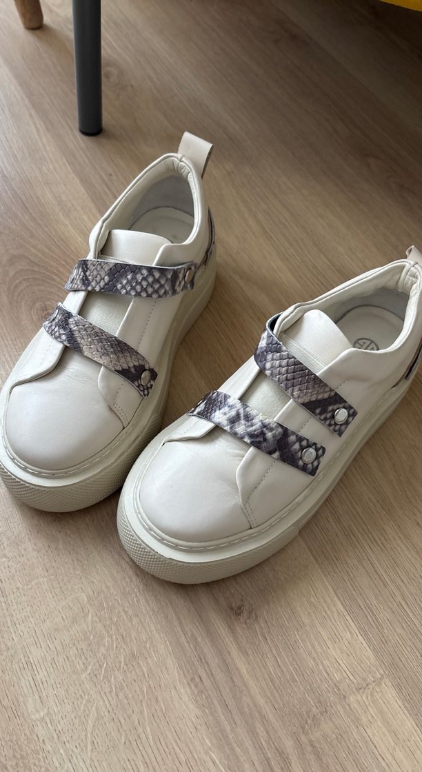 Yılan desenli kahve krem leoparlı bantlara sahip krem kadın spor ayakkabısı, platform topuklu ve cırt cırtlıdır. Kauçuk tabanlı, günlük kullanıma uygundur.