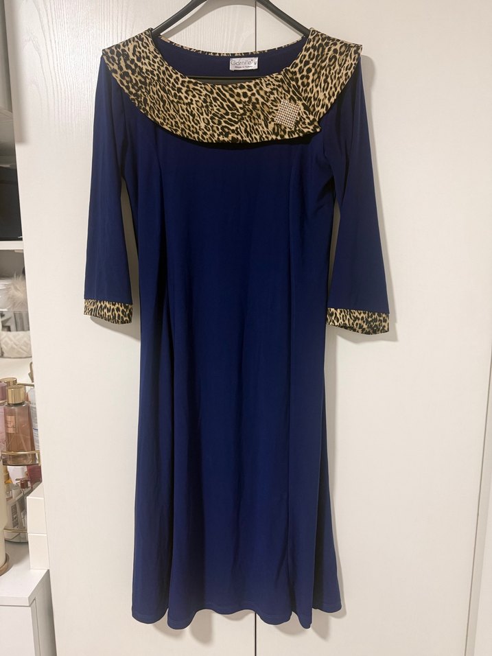 Lacivert uzun kollu, bol kesim elbise. Yaka ve manşetlerde yılan desenli drapeli detaylar, modern klasik tarzda ofis için uygun. İki koltuk altı 50 cm boy uzunluğu 100 cm