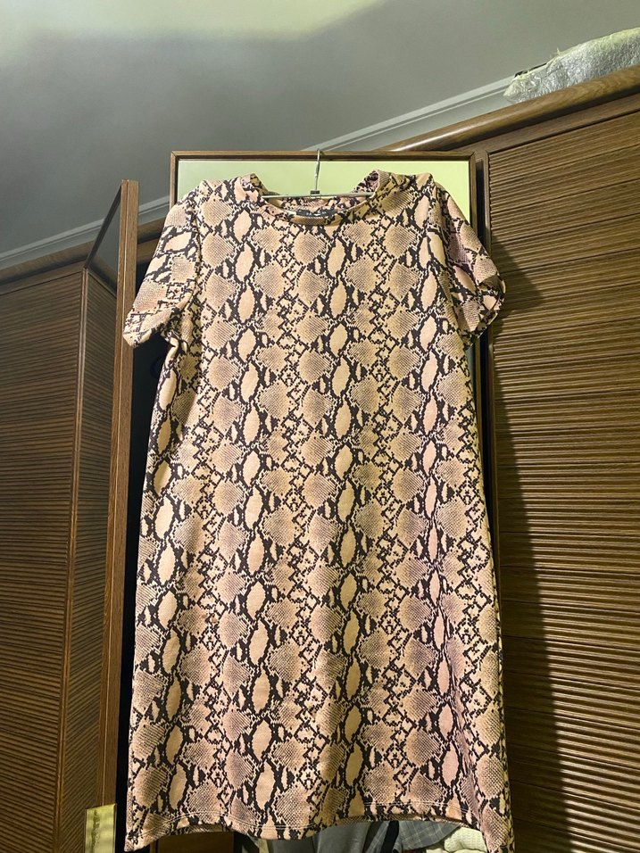 Yılan desenli, kısa kollu ve balıkçı yaka midi elbise, yumuşak sentetik kumaştan üretilmiş, bol kesim ve drapeli tarzda, günlük kullanıma uygundur.
