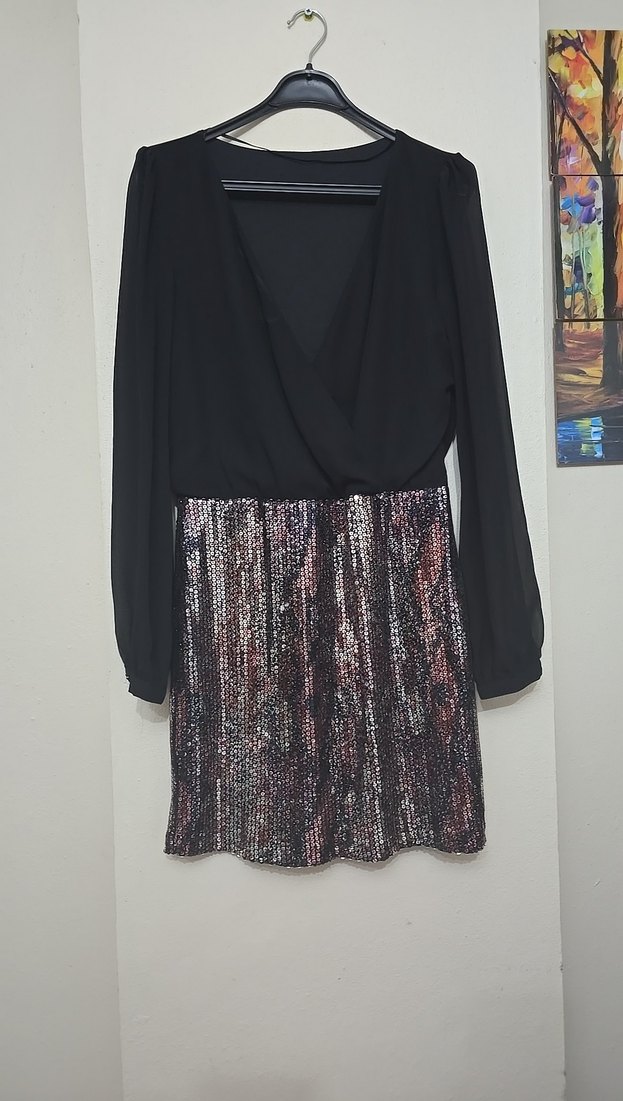 V yaka, uzun kollu ve bol kesim gece elbisesi. Mini etek çok renkli yılan desenli ve drapeli tasarıma sahip, partiler için uygun.