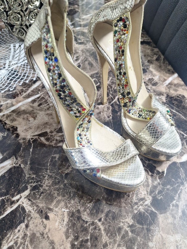 Yılan desenli ve çok renkli payetlerle süslenmiş, kauçuk malzemeden yapılmış modern stiletto topuklu ayakkabı. Düğün ve şık etkinlikler için uygun.
