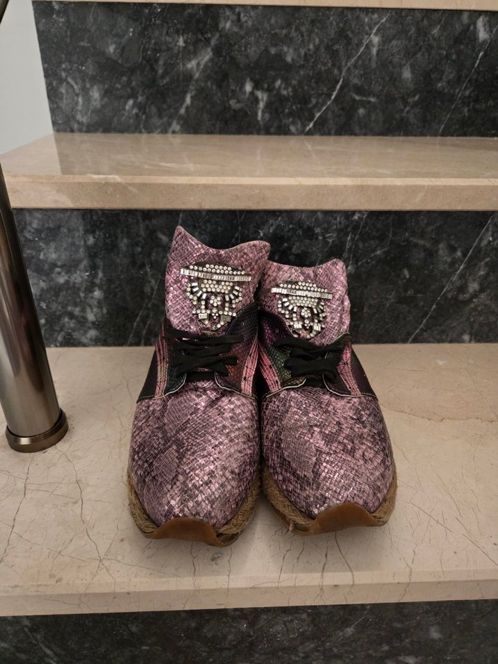 Koyu pembe yılan desenli kadın spor ayakkabılar, platform topuklu ve tokalı detaylara sahiptir, günlük sokak stili için kauçuk malzemeden üretilmiştir. sayılı giyildi