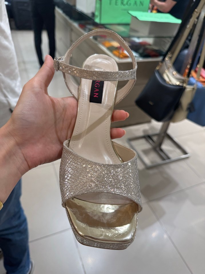 Altın simli yılan desenli, platform topuklu kadın abiye ayakkabısıdır. Tokalı kayışı ve çağdaş tasarımıyla düğünlerde şıklık sunar. Kauçuk malzemeden üretilmiştir. Nişanımda bir gece giyindim. Tertemiz hiçbir sorunu yok ve inanılmaz rahat bir ayakkabı