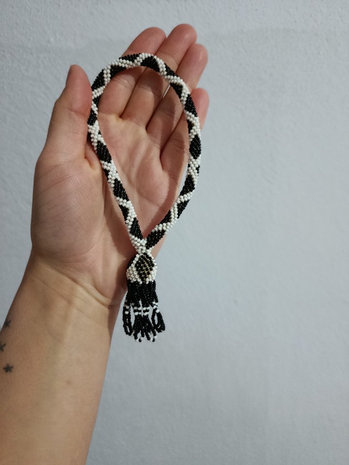 Siyah beyaz yılan desenli el zinciri, püskül detayıyla bohem ve minimalist tarzı yansıtıyor. Günlük kullanım için uygundur.