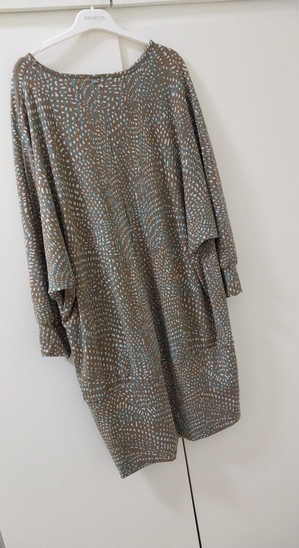 Yılan desenli, uzun kollu, salaş kesim ve drapeli triko elbise. Gri ve kahverengi tonlarında, günlük kullanıma uygun rahat bir model.