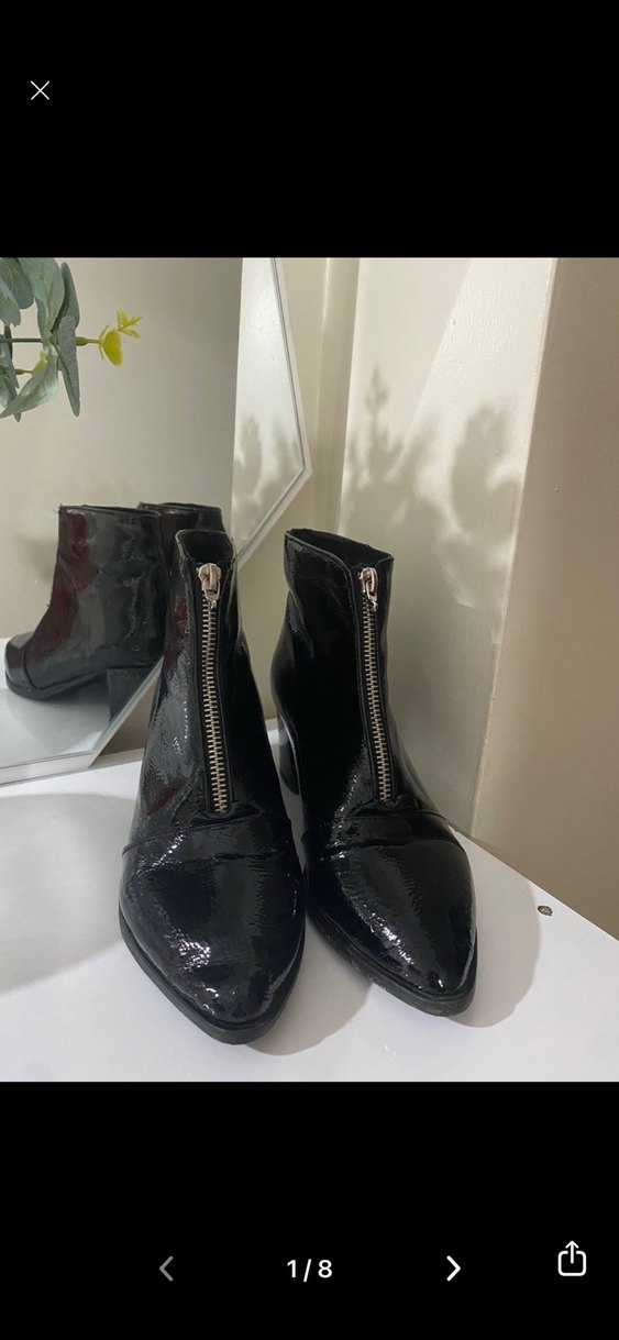 Yılan desenli siyah deri kadın bot, önde fermuar ve blok topuklu. Günlük kullanıma uygun, şık ve modern tasarım.