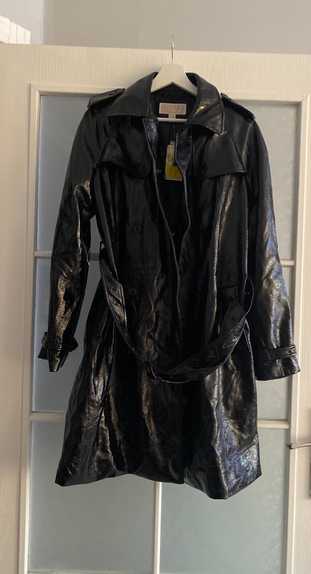 Yılan desenli siyah deri trençkot, kemerli ve vücuda oturan kesimlidir. Notlu yaka ve askılı kolları ile şık ürün yurtdışından alınmıştır