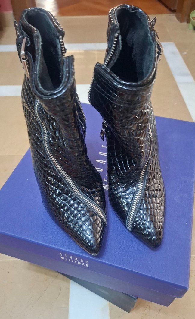 Yılan desenli siyah deri stiletto topuklu, fermuarlı botlar. özel yapım, çok az kullanılmış bot