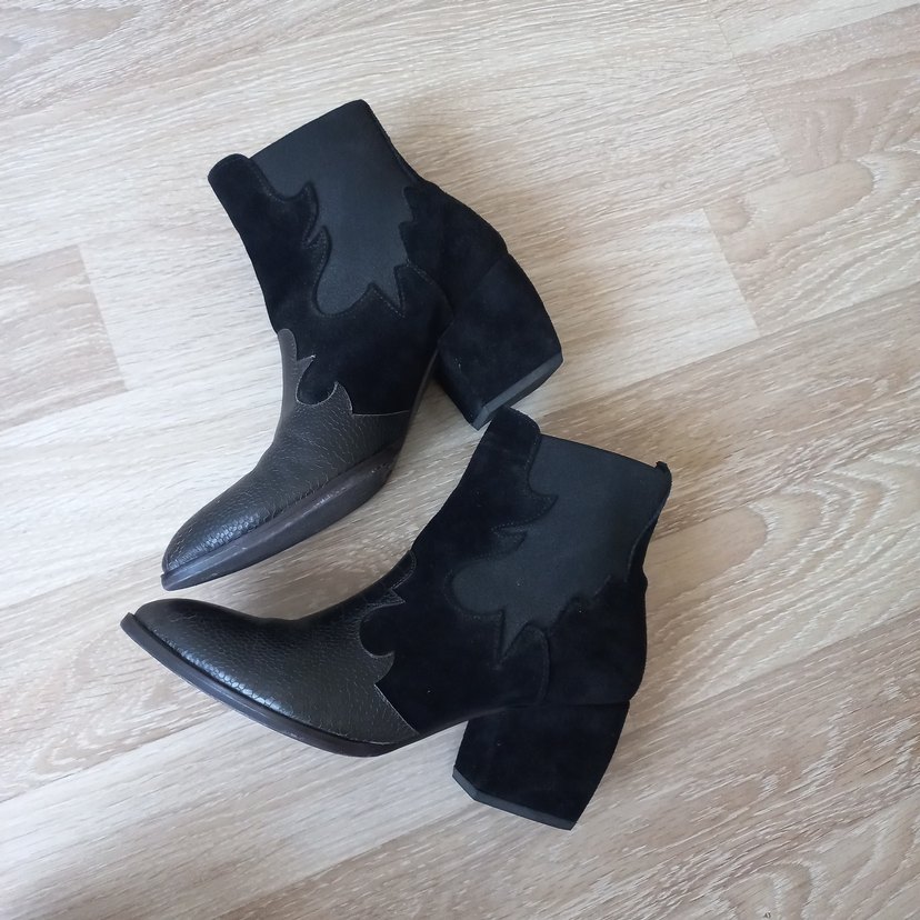 Siyah hakiki deri kadın bot, yılan desenli ve hakiki süet detaylı, stiletto topuklu, gotik ve şık tarz için ideal. Topuk yüksekliği 7.5 sm, Beymen klub markalı, çok az kullanılmış yeni gibi