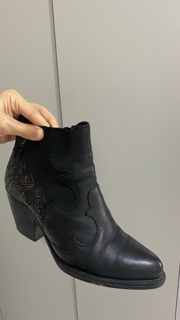 Siyah deri kadın botları, blok topuk ve yılan desenli detaylara sahiptir. günlük sokak tarzı için uygundur. Topuk boyu 5cm