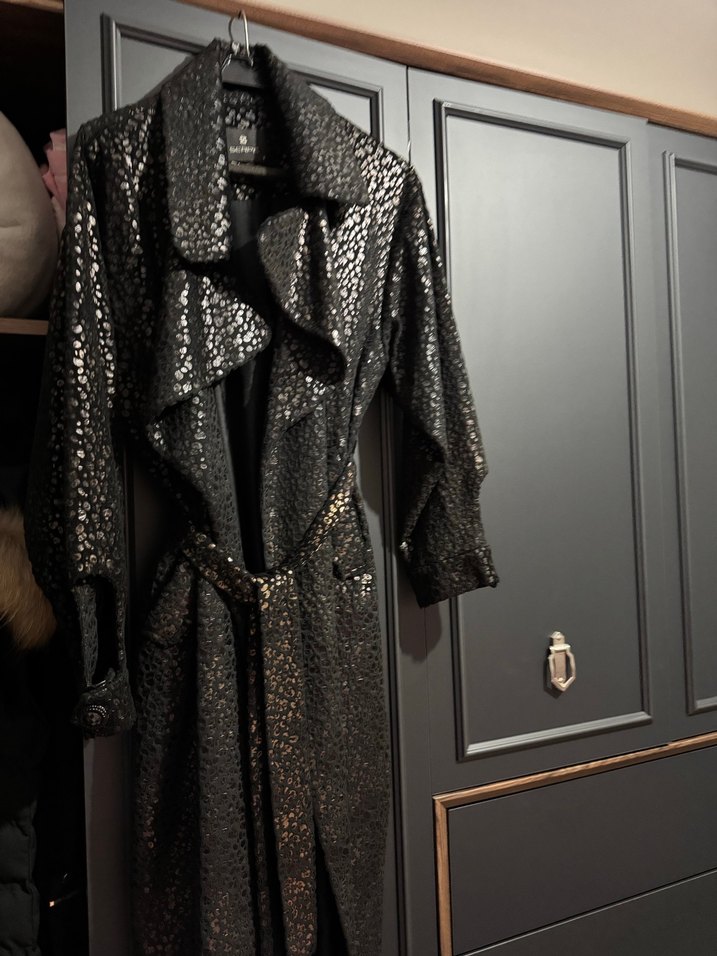 Yılan desenli, bel kemerli uzun siyah deri trençkot. Notlu yakalı ve askılı kolludur, bol kesimdir. Serpil marka