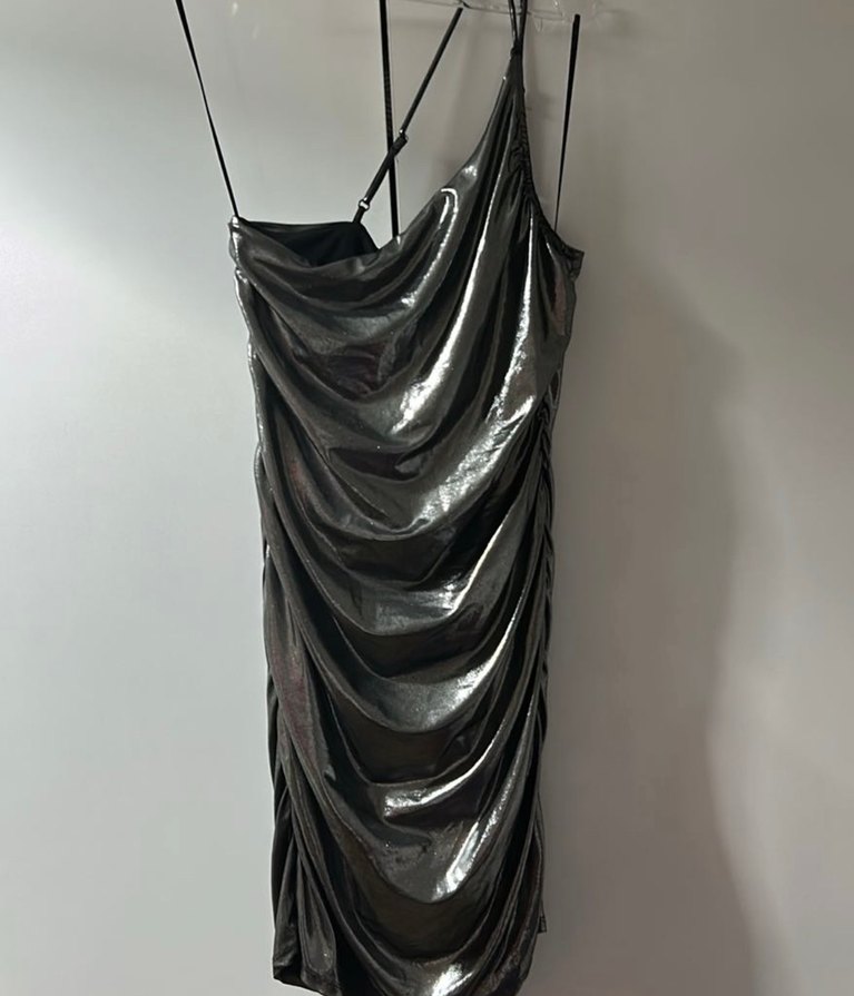 Bu siyah, yılan desenli abiye elbise, askılı ve straplez yaka ile drapeli tasarıma sahip. Uzun ve vücuda oturan kesimiyle parti için ideal, gotik tarzda.