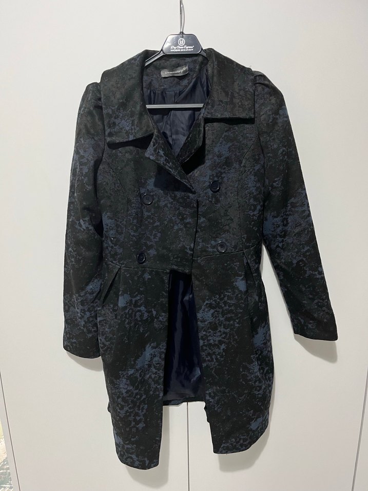 Düğmeli ön kısmı ve sivri yakası olan uzun siyah kaban, sentetik kumaş üzerine yılan desenlidir. Uzun kollu ve regular fit kesimdir, ofis için uygundur.