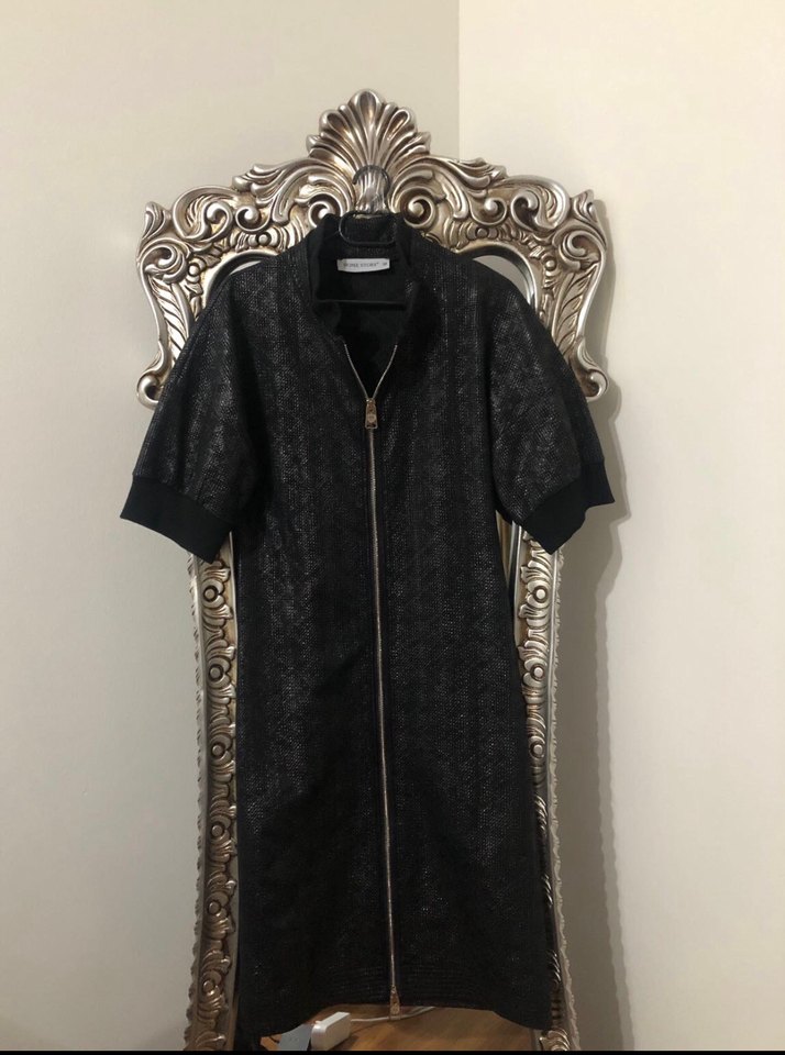 Dar kesim, yılan desenli siyah uzun elbise, kısa kollu ve önünde fermuar bulunur. Gotik tarza uygun.