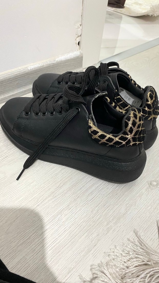 Siyah platform topuklu, bağcıklı, yılan desenli topuk detaylı, kauçuk malzemeden günlük kullanıma uygun kadın spor ayakkabı.