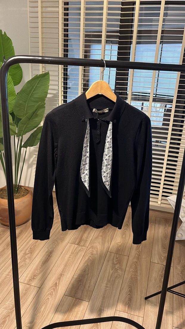 Uzun kollu, yılan desenli siyah triko kazak, halter yaka detaylarıyla ofis ve günlük kullanım için uygundur.