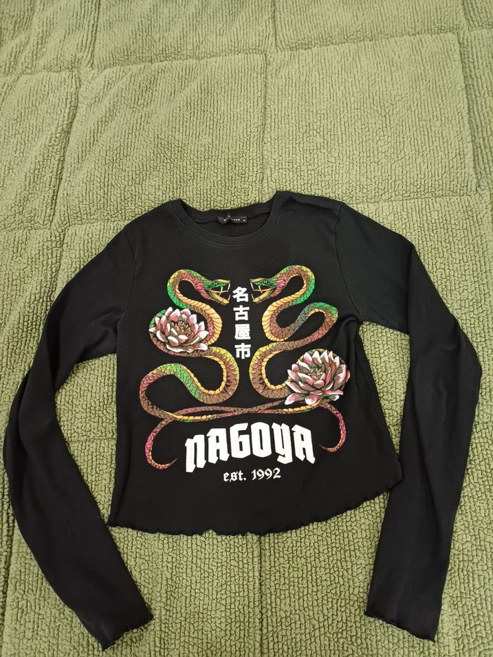 Uzun kollu, bisiklet yaka, yılan desenli ve çiçek detaylı siyah kız triko tişört. Rock punk tarzında, 'NAGOYA est. 1992' yazılı. m beden az kullanılmış