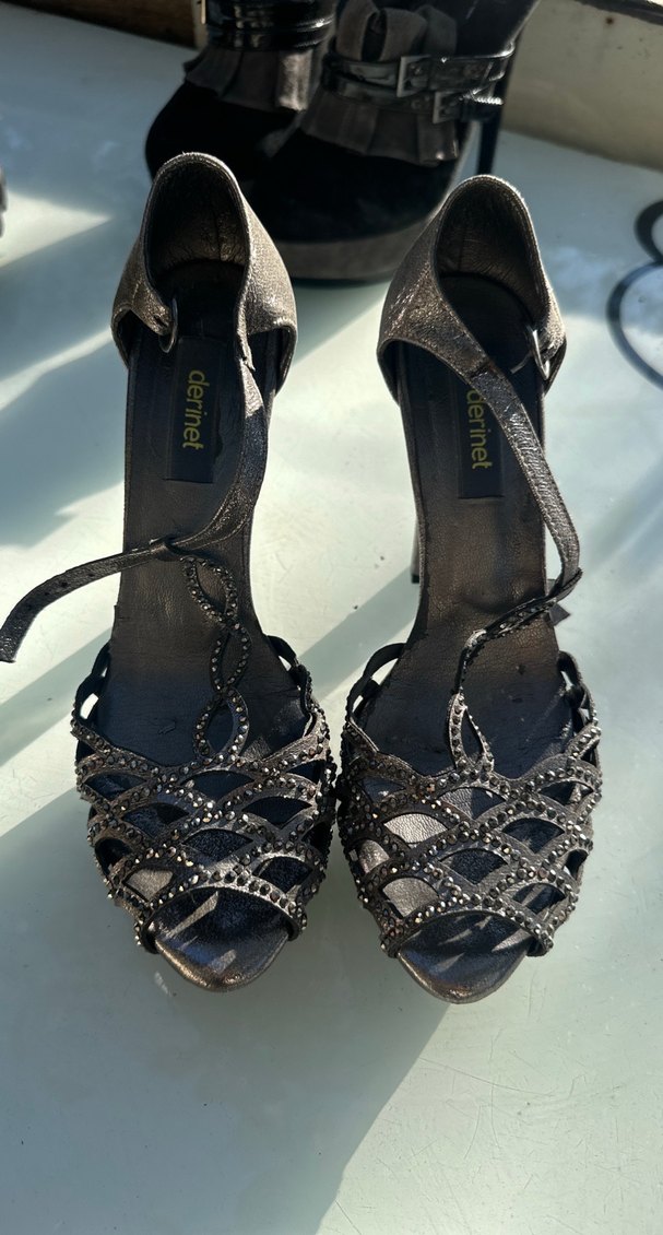 Siyah, yılan desenli, payetli yüksek topuklu ayakkabılar. Kauçuk malzemeden yapılmış, romantik gece için uygun.