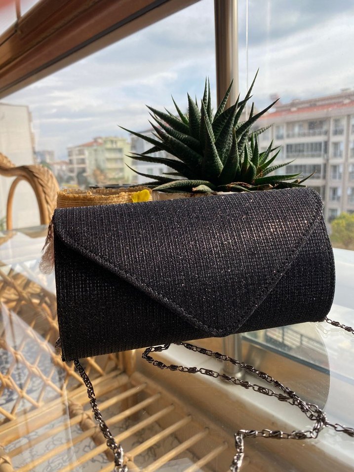 Siyah renkli, yılan desenli ve pilili tasarıma sahip zincir askılı kadın portföy çanta, trend sokak stiline uygundur.