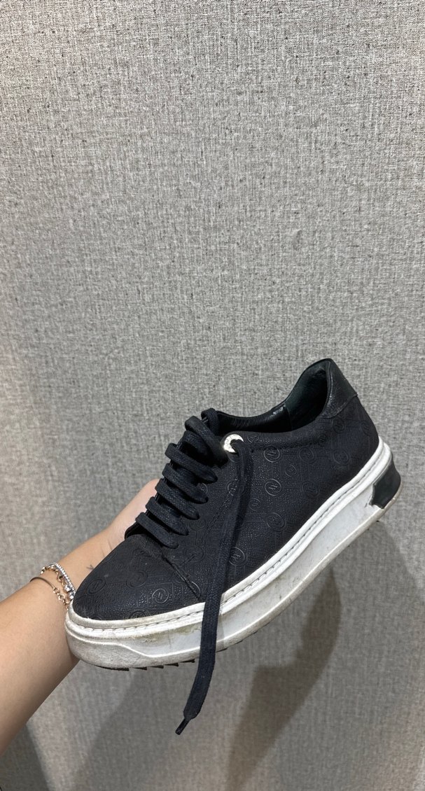 Yılan desenli siyah kadın spor ayakkabısı, platform tabanlı kauçuk malzemeden. Bağcıklı ve günlük sokak stili için gri tonlu.
