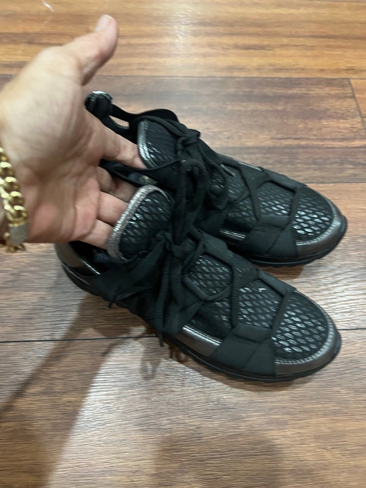 Yılan desenli, bağcıklı siyah platform topuklu spor ayakkabılar, goth tarzını athleisure rahatlığıyla birleştirir.