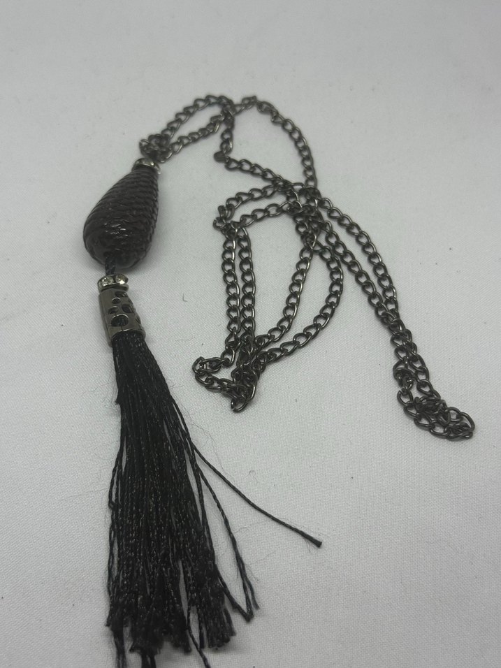 Yılan desenli uç ve püskül detaylı uzun siyah kolye, bohem ve gotik tarzlara uygundur. Günlük kullanıma uygun.