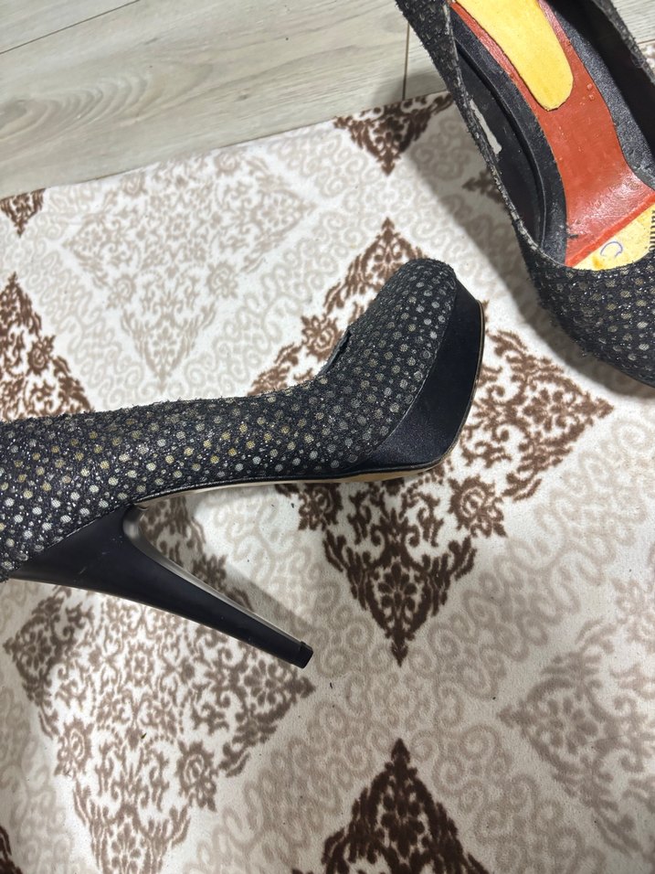 Yılan desenli siyah stiletto topuklu ayakkabılar, renkli detaylar ve cırt cırtlı bant ile romantik akşamlar için modern ve Paris tarzı bir görünüm sunar.