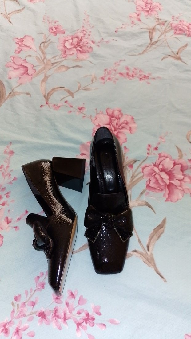 Yılan desenli siyah stiletto, blok topuklu ve kurdele detaylı. Kauçuk malzemeden, romantik akşamlar için uygun.