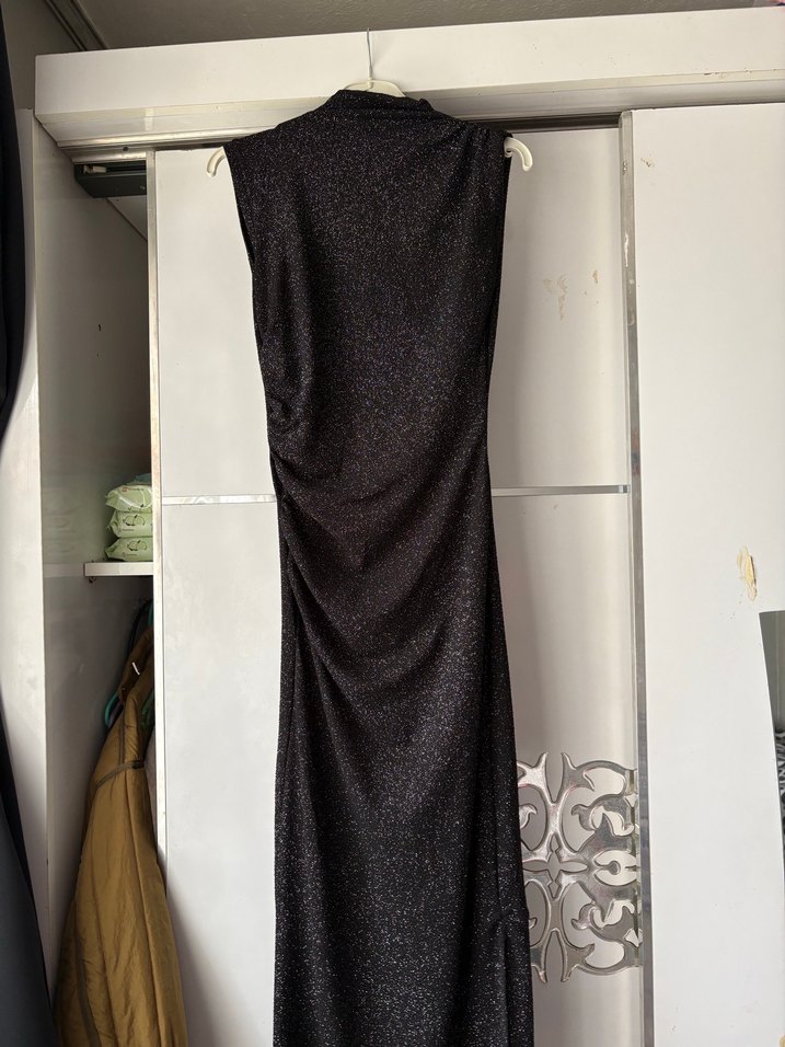 Kolsuz, yüksek yakalı ve vücuda oturan siyah uzun elbise, yumuşak sentetik kumaştan ve yılan desenli. Drapeli detaylarıyla gösterişli parti tarzı için uygun.