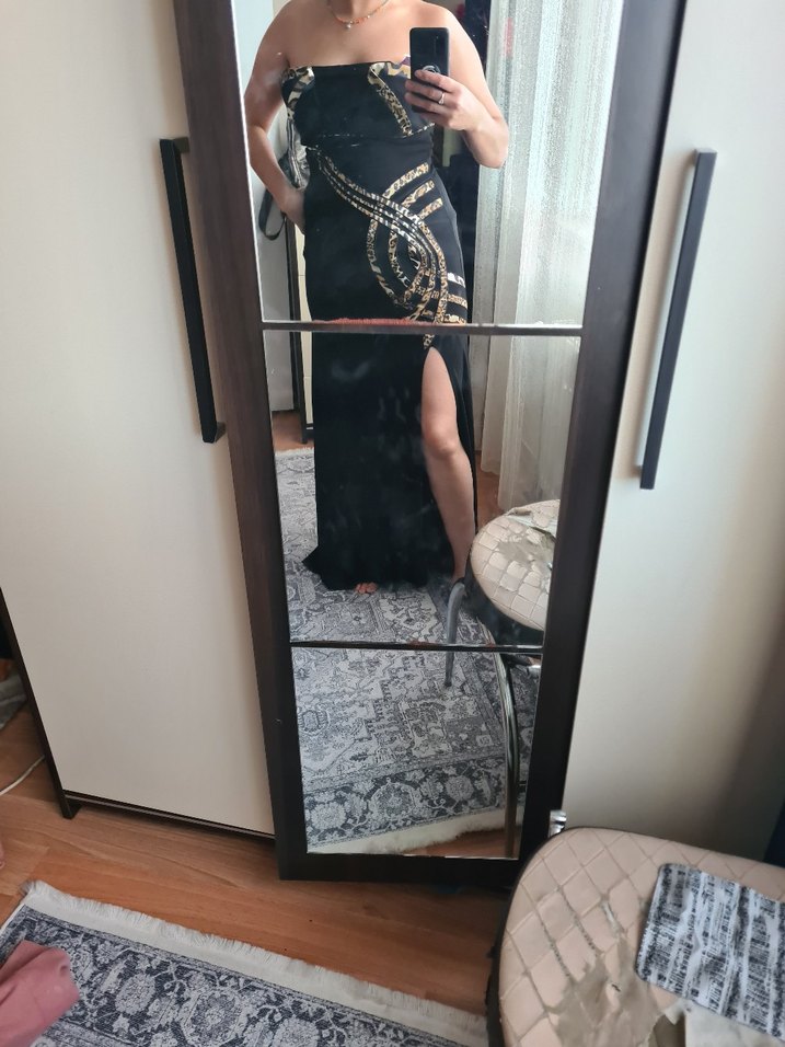 Yılan Desenli Siyah Uzun Straplez Abiye Elbise