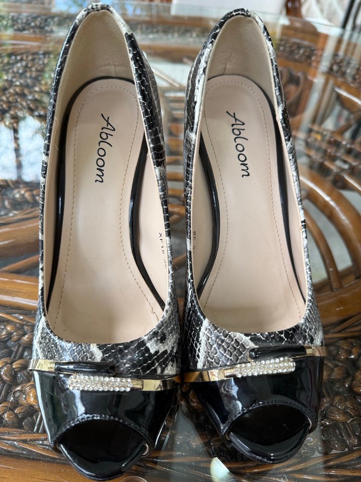 Abloom markalı, siyah kısmı rugan(parlak), yılan desenli mat olacak şekilde tasarlanmış,yüksek topuklu ama gizli platformlu olm AA su sebebiyle rahat kullanımlı kadın ayakkabısı, Üst kısmı ışıltı ve altın rengi detaylı ve çağdaş tarzda tasarlanmıştır.