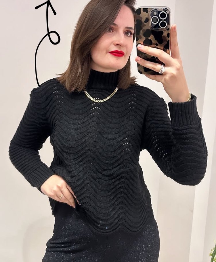 Yılan Desenli Siyah Yüksek Yaka Triko Kazak