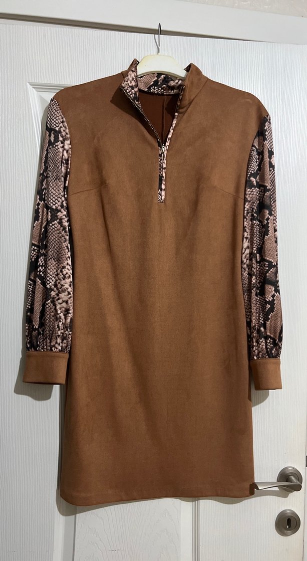 Uzun kahverengi süet elbise , yüksek yakalı ve fermuarlı. Uzun kollarda yılan deseni detaylı, bol kesim rahat kullanım sağlar.