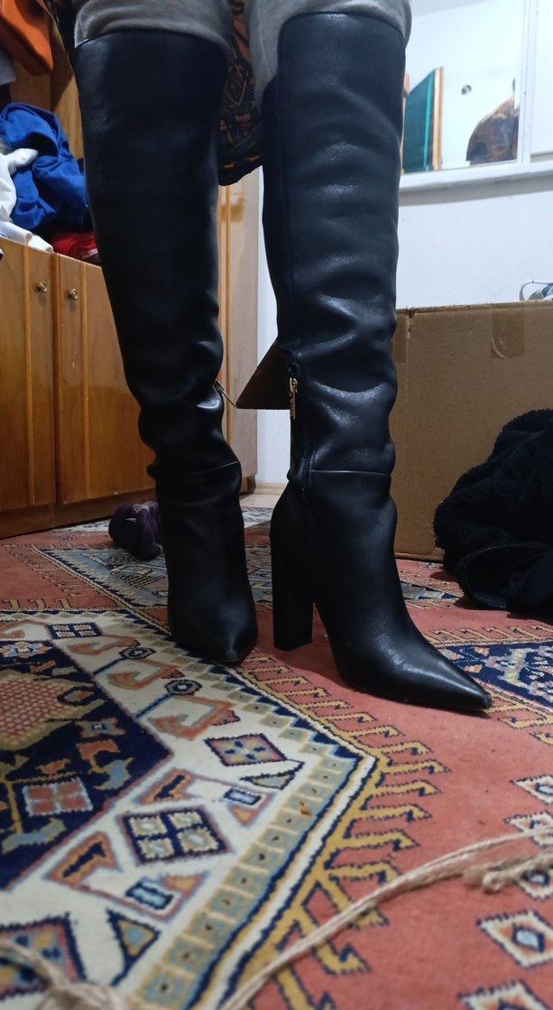 Siyah deri dizüstü çizme, koyu yılan desenli, stiletto topuklu ve tokalı detaylıdır. Günlük kullanıma uygun cesur goth tarzını yansıtır.