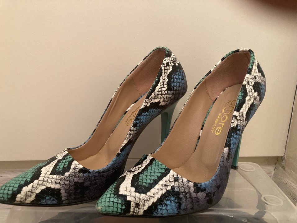 Turkuaz renkte, yılan desenli ve bağcıklı tasarıma sahip, kauçuk malzemeden günlük kullanıma uygun stiletto topuklu ayakkabı.