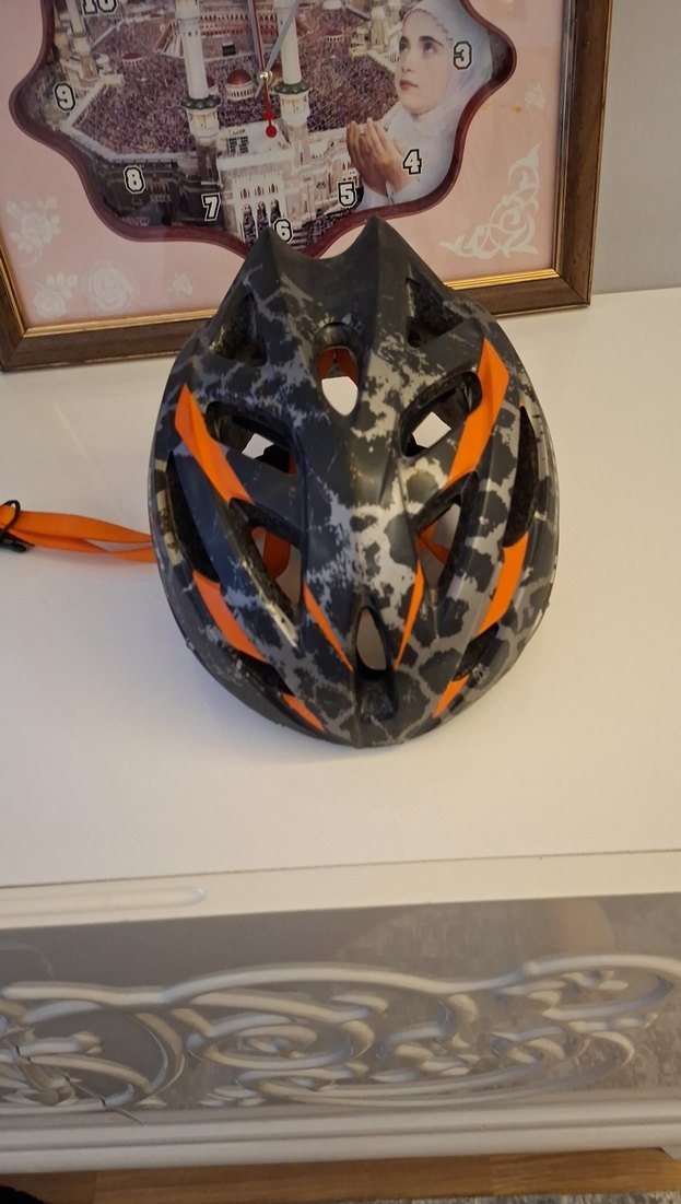 Dayanıklı plastikten yapılmış, yılan desenli koyu renkli turuncu detaylı biker kask. Güvenli kullanım için cırt cırtlı bant içerir.