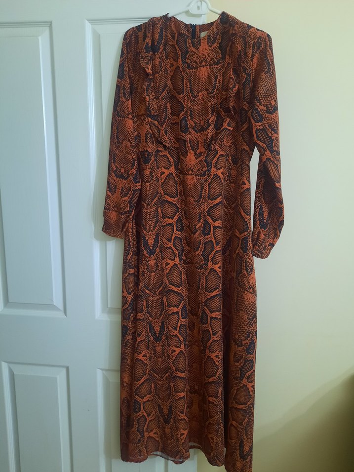 Yılan desenli, kahverengi uzun elbise. Drapeli, uzun kollu, V yaka ve bol kesim. Sentetik kumaştan yapılmış bohem tarzda.