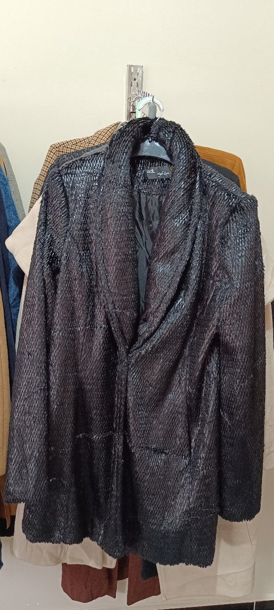 Sentetik kumaştan, yılan desenli, drapeli ve notalı yakalı uzun gri kadın kaban. Uzun kollu ve regular fit.