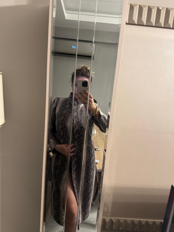 Yılan desenli, uzun kollu ve yüksek yakalı, vücuda oturan gri uzun trenckot. pamuk kumaştan ve yırtmaçlı, günlük kullanım için uygun.