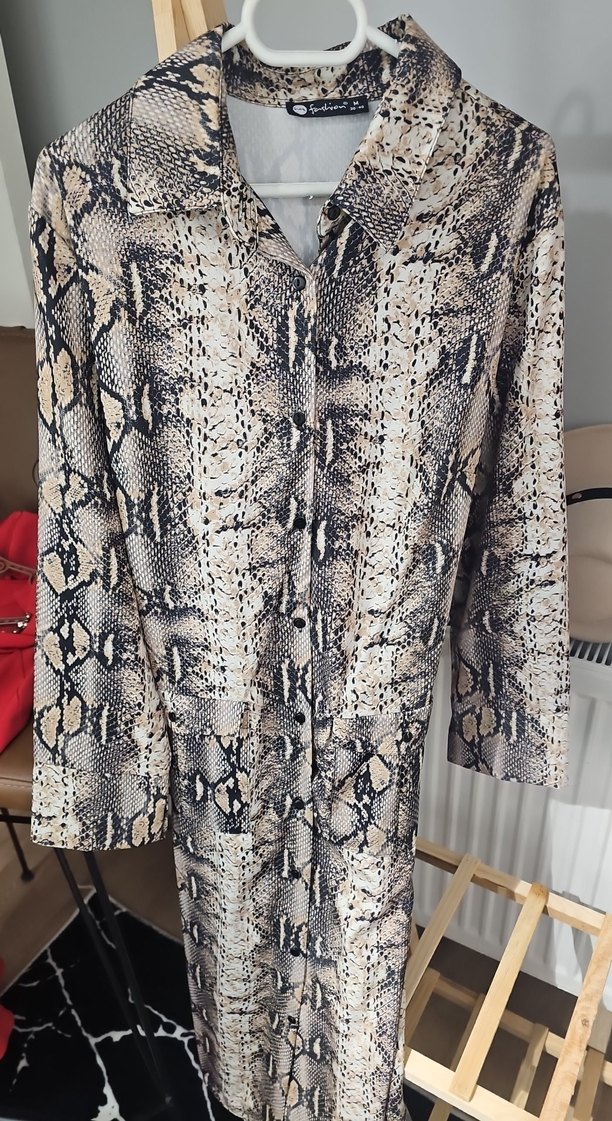 Gri yılan desenli uzun, bol kesim hamile kabanı. Uzun kollu, düğmeli ve sentetik kumaştan, sokak stili için uygun.