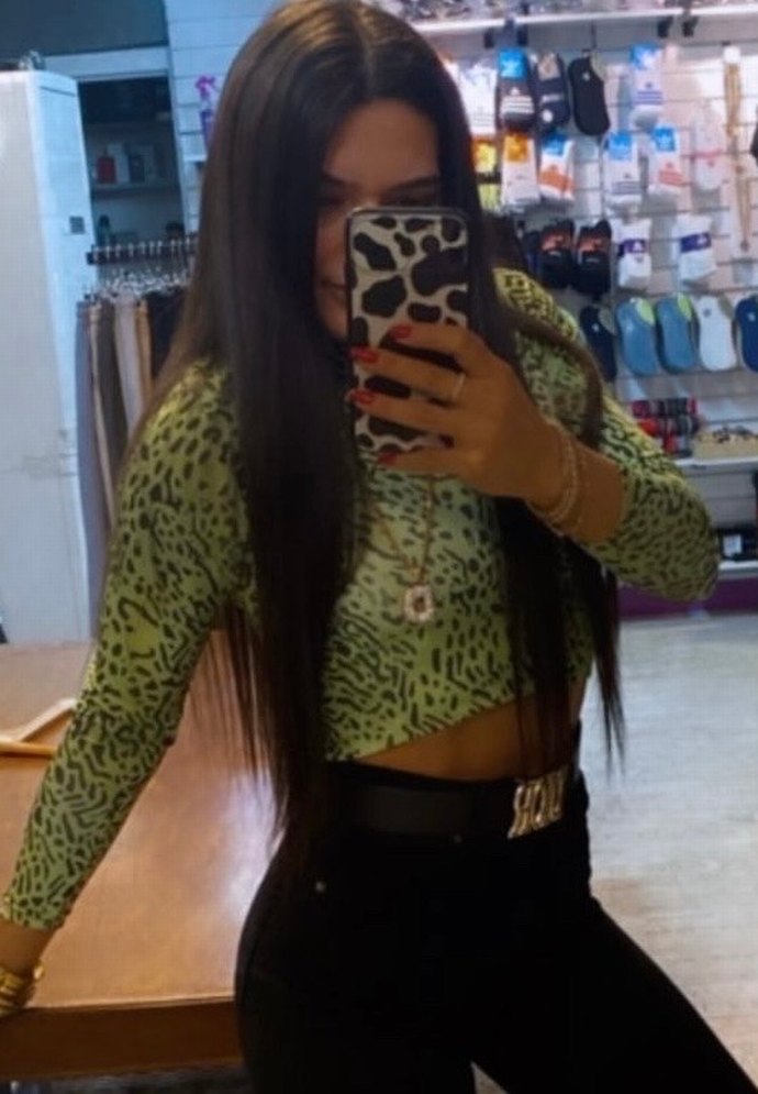 Yüksek yakalı, uzun kollu, yılan desenli deri bluz, kemerli ve dar kesim. Günlük sokak stiline uygun.