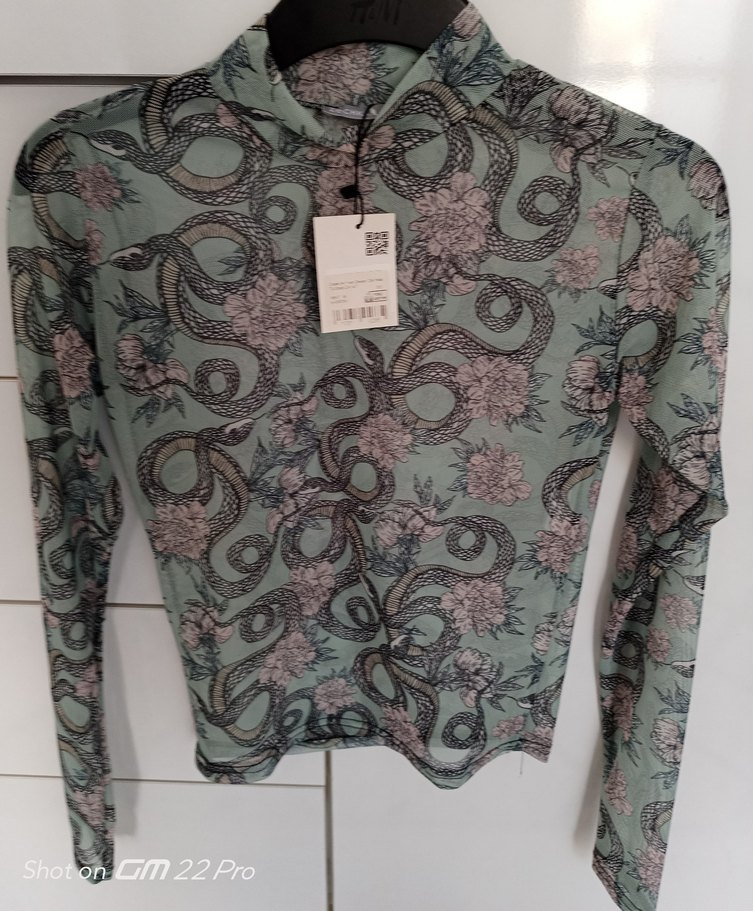 Gri yılan desenli, uzun kollu ve boğazlı, sentetik örme kumaştan kısa kesim dar kesim bluz. Günlük sokak modası için uygun.