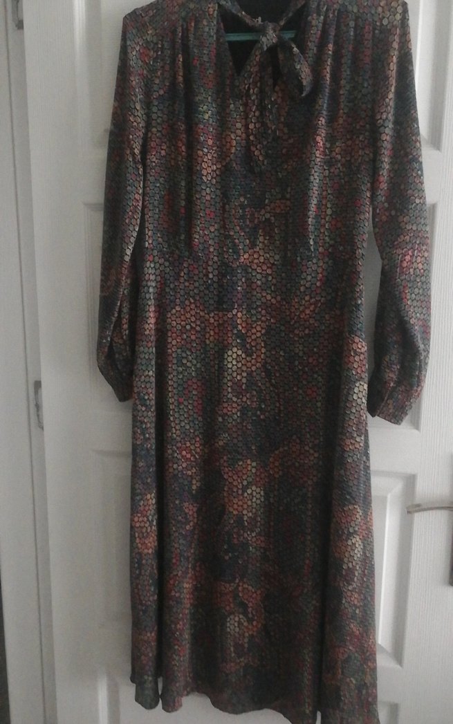 Bu uzun, bol kesim kadın elbisesi koyu renkli çok renkli yılan desenine, yakalı ve uzun kollu tasarıma sahiptir. Dökümlü yapısı ve sentetik kumaşıyla ofise uygundur.