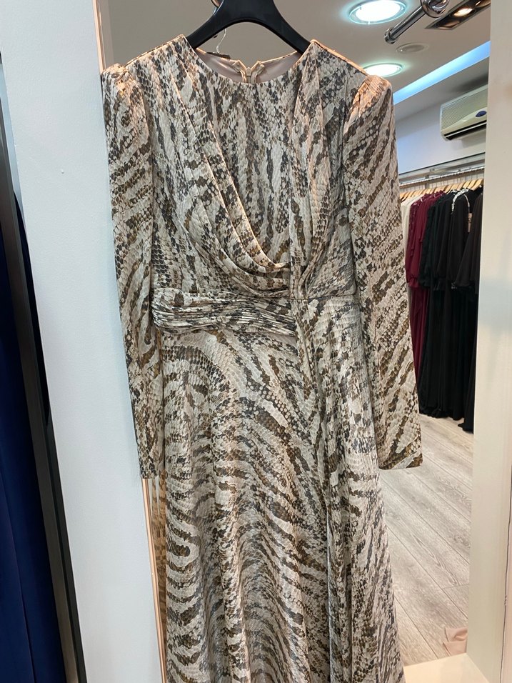 Yılan desenli, drapeli uzun kollu kadın elbisesi. Tekne yaka ve bol kesimiyle çağdaş tarzda, kahverengi ve gri tonlarında ofis için uygun. Firma ürünü etiketli