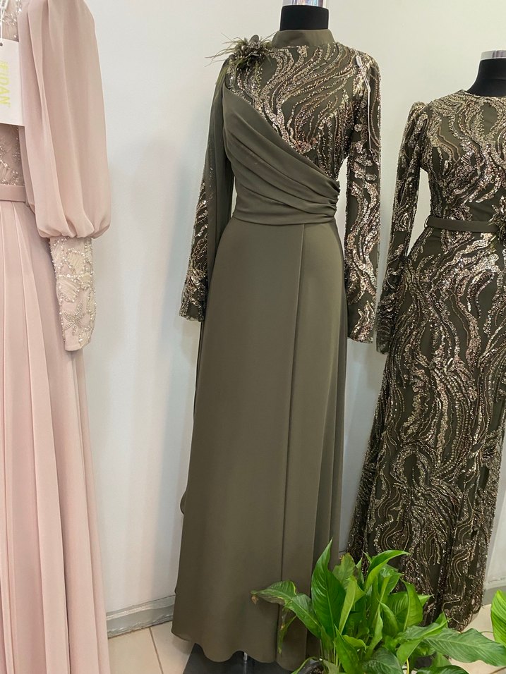 Bu haki uzun abiye elbise, yüksek yakalı ve uzun kolludur. Drapeli bel tasarımı ve yılan desenli deseniyle modern klasik bir hava sunar. Düğünler için uygundur ve normal kesimlidir. ✨Firma ürünü etiketli
