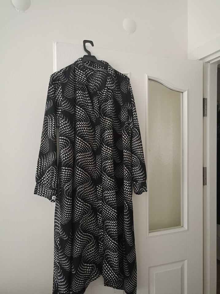 Yüksek yakalı, uzun kollu ve pilili tasarıma sahip siyah uzun tunik. Yılan desenli ve bol kesim, çağdaş avant-garde tarzını yansıtıyor. özel dıkım ceplı kumaşı yakmaz