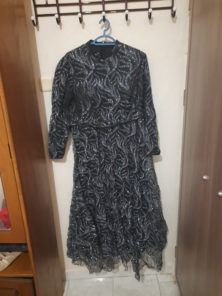 Yılan desenli, uzun kollu, yüksek yakalı ve bol kesim siyah gece elbisesi. Fırfır detayları ile gotik ve avangart tarzda parti için uygundur.