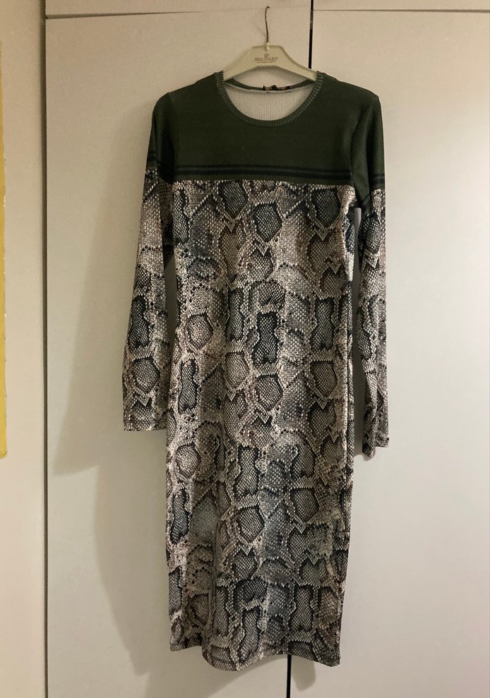 Yılan desenli, uzun kollu ve yuvarlak yakalı triko elbise. Rahat ve şık yapısıyla sokak modasına uygun, gri tonlarında örme sentetik kumaştan üretilmiştir. 42 yazıyor ama bence L beden