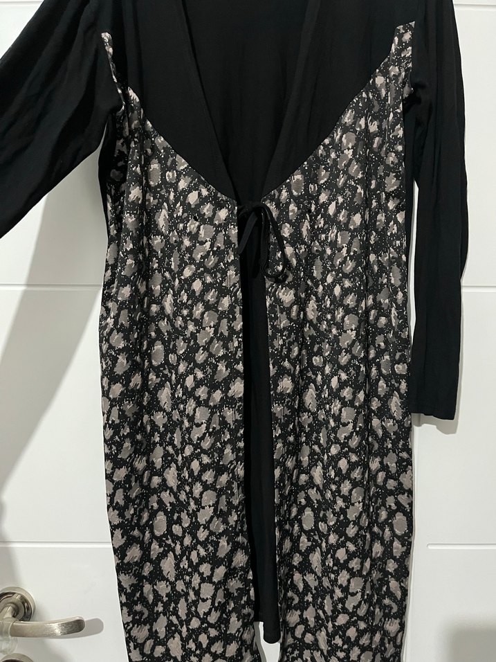 Bu uzun siyah hamile kaban, yılan desenli ve bol kesimdir. Uzun kollu, V yakalı ve dökümlü tasarıma sahiptir. Avant-garde gotik tarzındadır, günlük kullanım için uygundur. Üründe birkaç yerde defo vardır