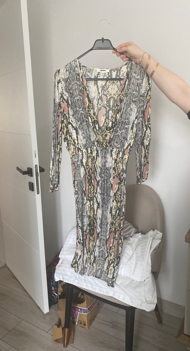 Yılan desenli, uzun ve bol kesim elbise. Uzun kollu ve V yakalı, gri tonlarda yumuşak sentetik kumaştan, bohem tarzda.